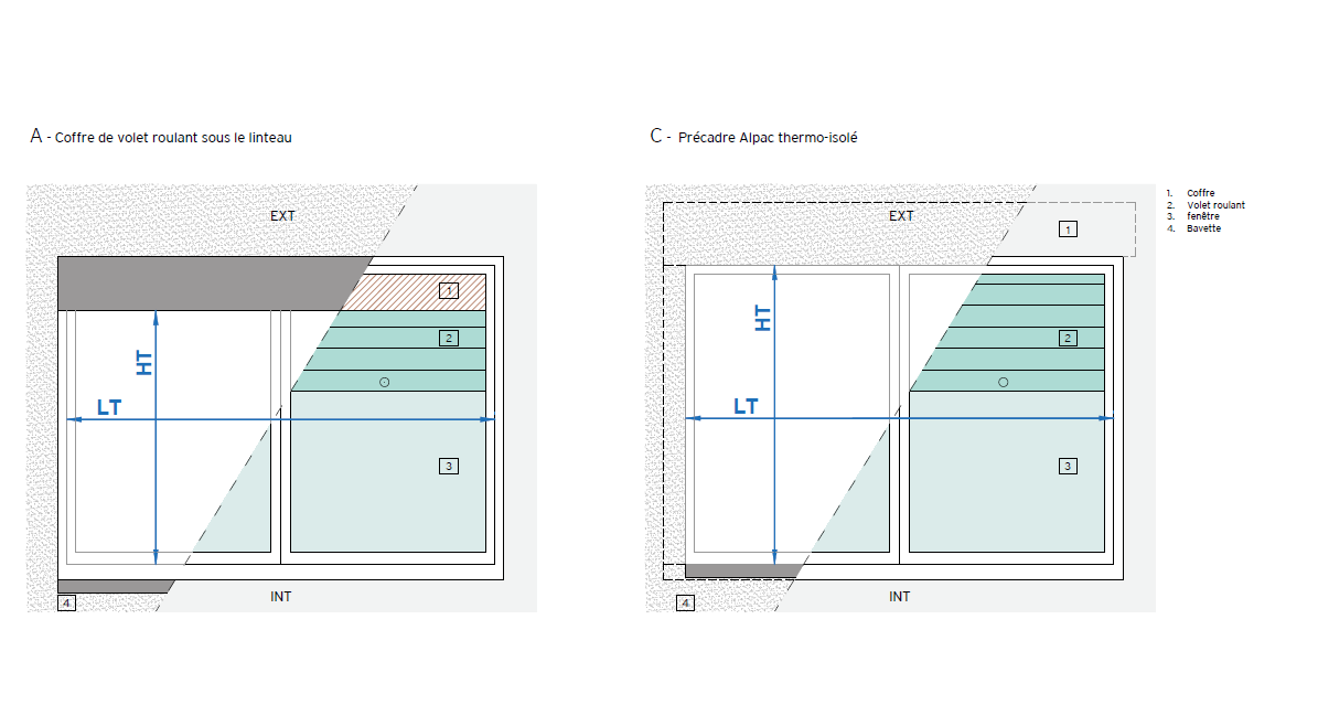 Le caisson intégré au précadre thermo-isolé ALPAC se positionne lui aussi en applique. Mais en tant que partie intégrante d’une solution complète de traitement du tour de la baie, il conjugue esthétique, performance thermique et rapidité d’installation. À cela s’ajoute la préservation intégrale du clair de jour, puisque le précadre n’empiète sur aucun des quatre côtés de la baie.